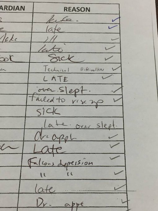 Another child attributed their tardiness to “Falcons depression.” The child who signed in immediately after was apparently too depressed to even write out the words, choosing instead to just use quotation marks to indicate the same reason.